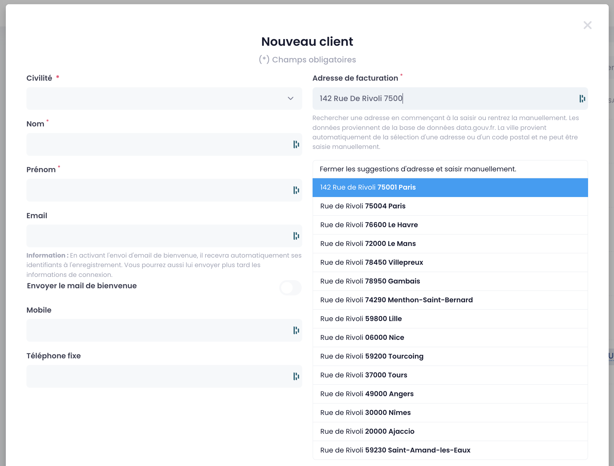 Lorsque je saisis les informations, je peux cocher l'option mail de bienvenue.