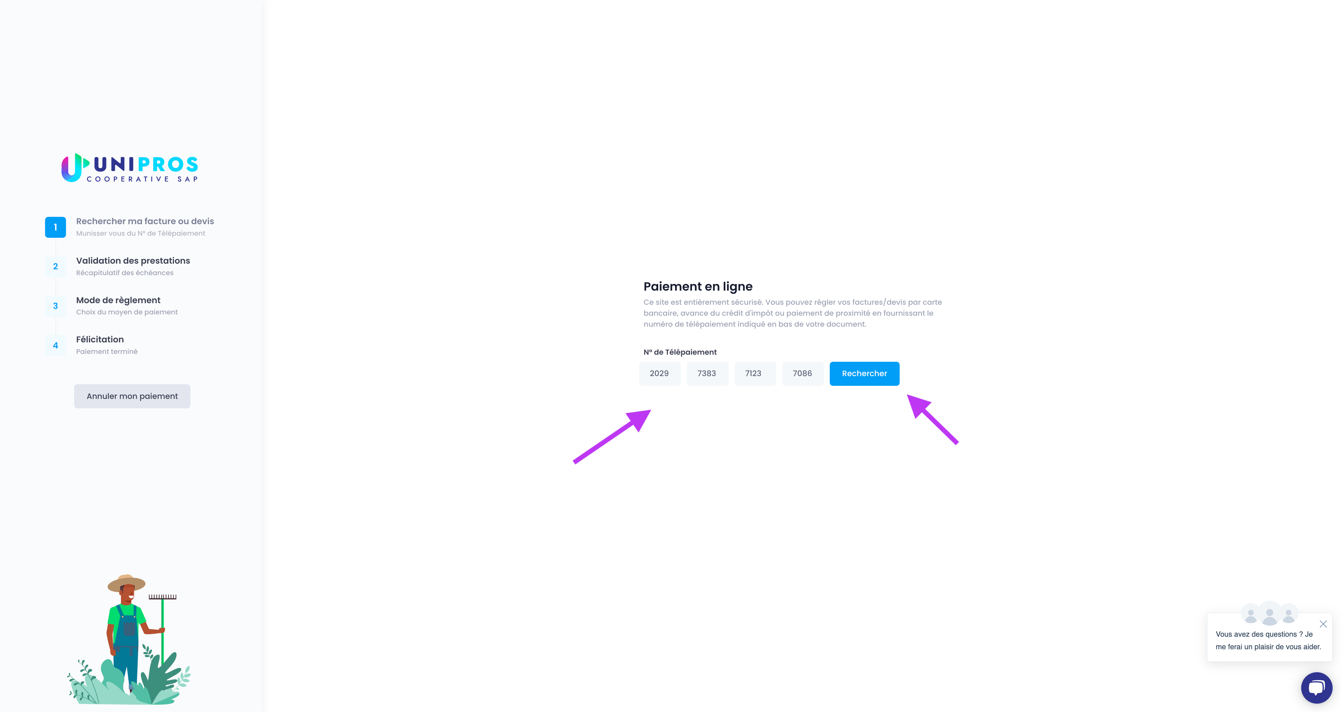- Par avance immédiate* ou CB : en cliquant sur le numéro de télépaiement qui se trouve sur ma facture ou sur paiement.unipros.coop.