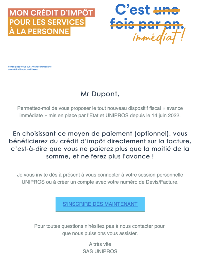 Depuis mon interface professionnelle je dispose de 2 façons d'envoyer un mail à mon / mes clients pour les informer de la disponibilité du dispositif de l'avance immédiate.