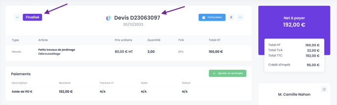 Votre devis passe alors en statut "Finalisé" et un numéro de devis lui est attribué.