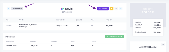 Le devis passe de nouveau en statut "Provisoire" avec les modifications apportées au préalable.